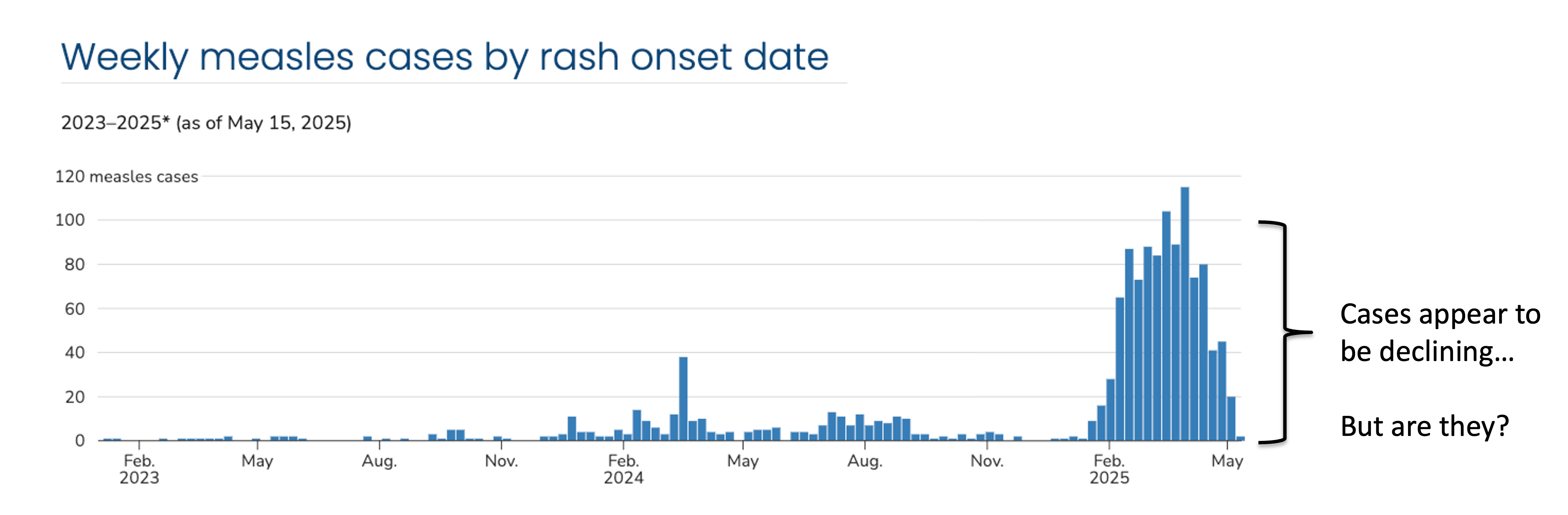 Here’s an example from the 2024-2025 measles outbreak in the U.S. Cases are indexed by the date of rash onset – which means in real-time cases are getting assigned to previous dates. It takes time from the onset of rash to seek healthcare, through test collection and processing, and finally to reporting the test results, which means the delay between rash onset and when that case appears in the data can be many weeks. On May 15, 2025, we will not be aware of any rash onsets on that day, and only very few, even from the previous week, resulting in the characteristic downward bias we see in this data. At the time, cases were in fact declining, but due to right-truncation, it was difficult to disentangle whether this was a decline or simply missing reports.