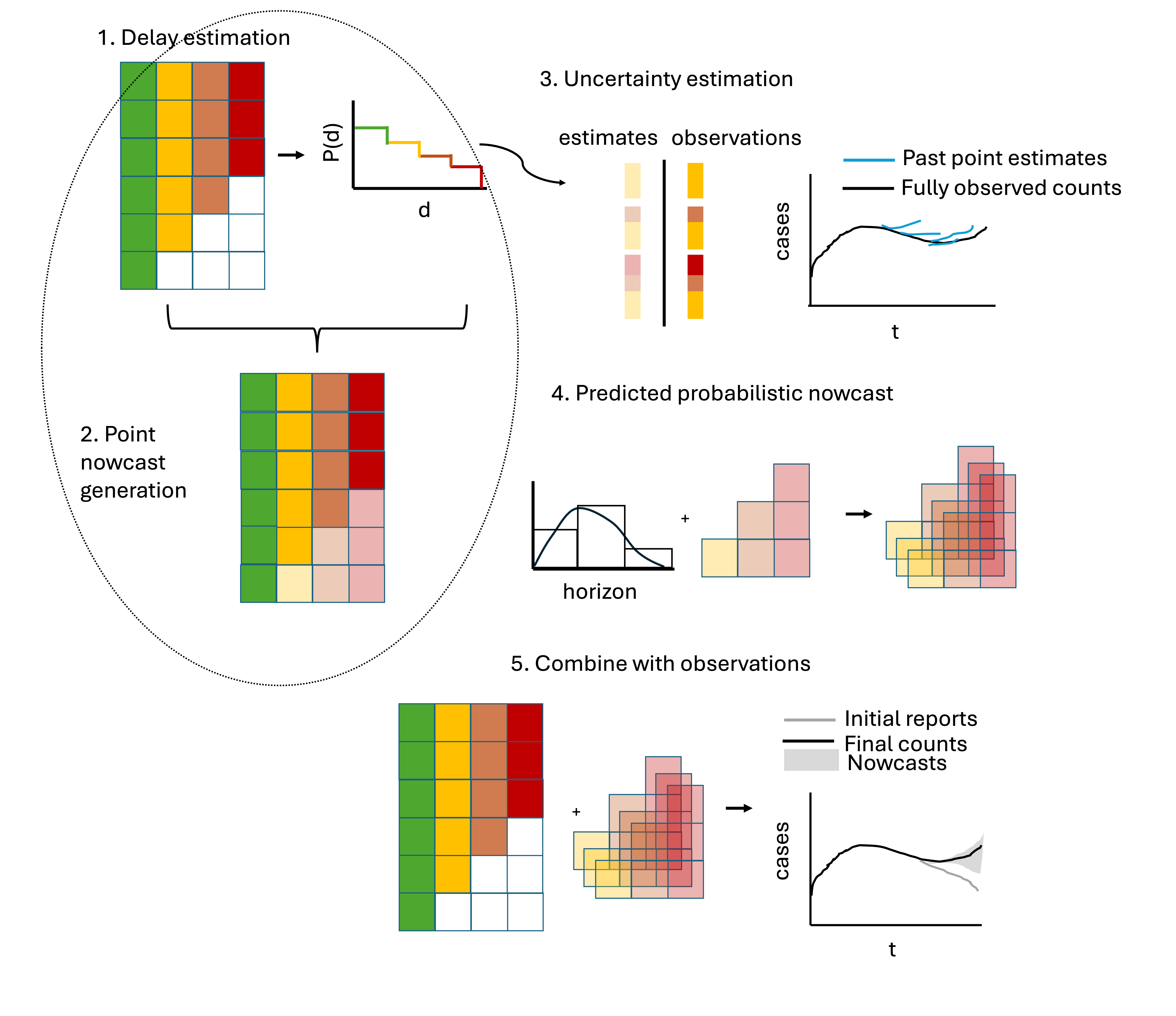 baselinenowcastGitHub.The package is still in-development, so we particularly welcome feedback on how to improve the user-interface and communication of the method, and ways that it will be easier to adopt the method into routine public health practice. Feel free to send us an email directly (kaitlyn.johnson@lshtm.ac.uk) or post in the epinowcast forum.