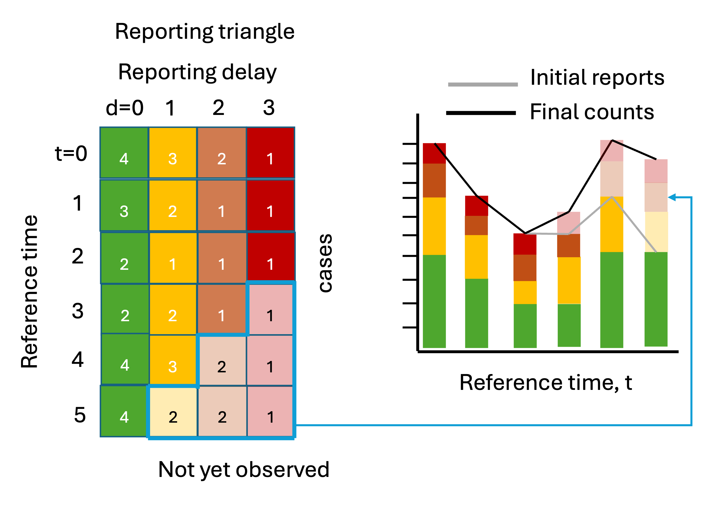For example, if we index cases by symptom onset in real-time, the cases from the most recent time will be incomplete because cases reported with longer delays have yet to be observed, i.e. these events are “right-truncated”. These are represented by the lighter shaded squares in the reporting triangle and the bars on the right.